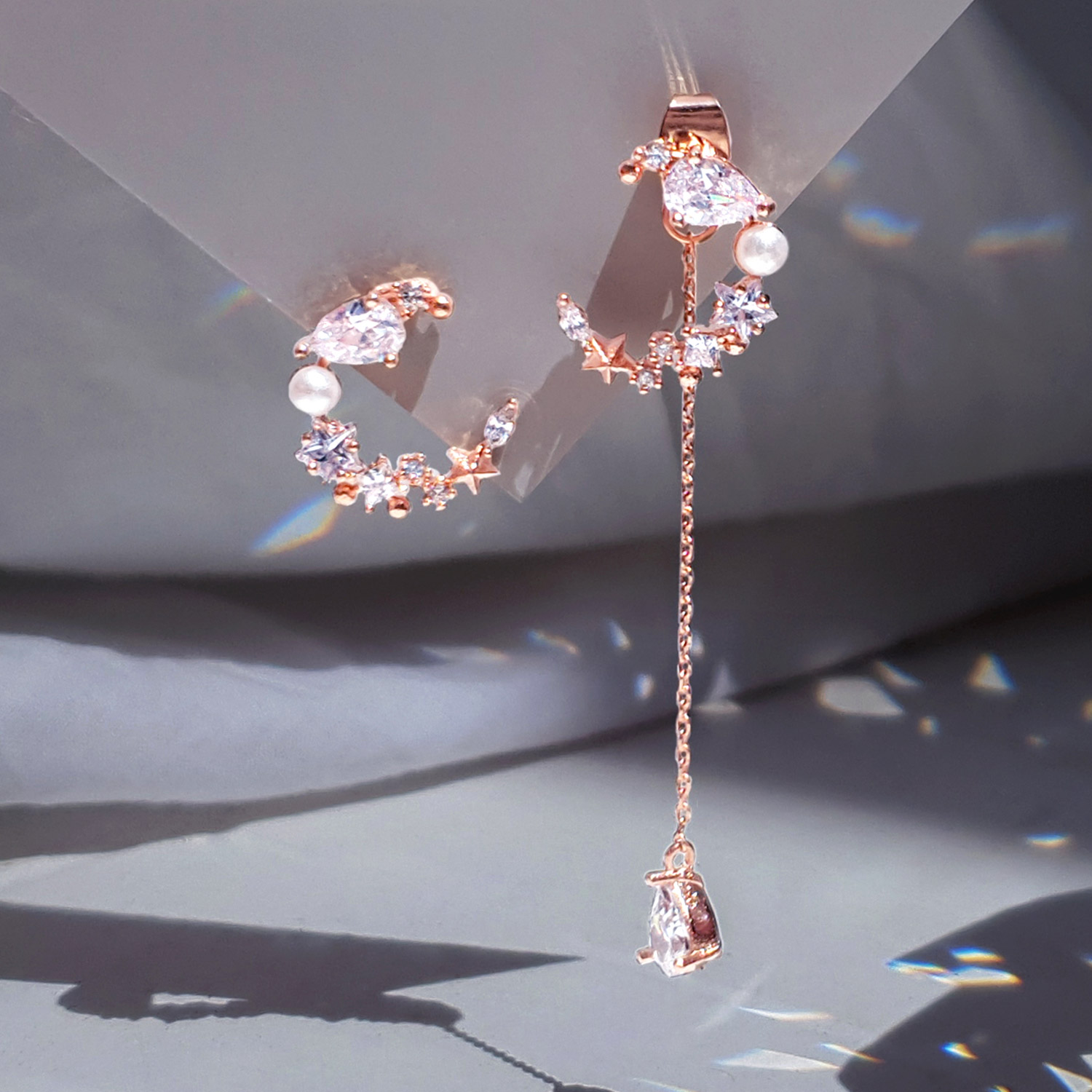 多樣的配戴方式 可以單獨佩戴新月耳環 或一隻耳朵搭配水滴墜鏈 不對稱的風格 更顯獨特